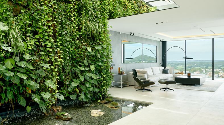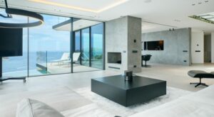 Das Erdgeschoss beeindruckt mit einem weitläufigen Eingangsfoyer, einem lichtdurchfluteten Wohnzimmer mit Kamin und Meerblick sowie einem Arbeitsbereich mit einem privaten botanischen Garten und Wasserfall. Das angrenzende Esszimmer geht fließend in eine moderne, offene Küche über. Ebenfalls im Erdgeschoss befindet sich ein großes Schlafzimmer mit eigenem Bad.