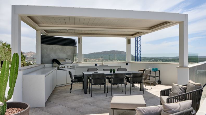 Die Dachterrasse bietet eine überdachte Außenküche und einen Essbereich. Eine große Sonnenterrasse und der beheizte Pool mit Kindersicherung laden zum Entspannen ein. Die Ausstattung der Villa wird durch eine Garage mit Platz für vier Fahrzeuge, Klimaanlage, Fußbodenheizung, Sicherheitsglas, Alarmanlage und Kamerasystem abgerundet.