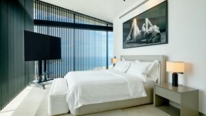 Das Obergeschoss verfügt über drei weitere Schlafzimmer, alle mit eigenen Bädern, zwei davon als en-suite Bäder ausgeführt. Die Schlafzimmer bieten Zugang zu einer privaten Terrasse. Ein angeschlossener Fitnessraum mit Duschbad ist ebenfalls auf dieser Etage vorhanden.