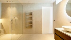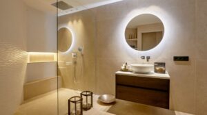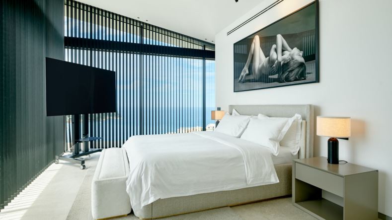 Der Aufzug verbindet alle Ebenen und führt in das Obergeschoss, in dem drei weitere Schlafzimmer mit jeweils eigenem Bad untergebracht sind, zwei davon als en-suite Bäder. Jedes dieser Schlafzimmer besitzt einen direkten Zugang zur Terrasse und bietet einen herrlichen Blick auf das Mittelmeer. Ein privater Fitnessraum mit angeschlossenem Duschbad rundet das Angebot auf dieser Etage ab. Im separaten Untergeschoss befindet sich eine luxuriöse, verglaste Sauna mit angrenzendem Ruhebereich sowie ein weiteres flexibles Zimmer, das als Kinderzimmer, Hauswirtschaftsraum oder Heimkino genutzt werden kann. Zusätzlich verfügt dieses Geschoss über einen stilvollen Weinkeller.