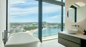 Diese exklusive Villa in Santa Ponsa bietet auf 589 m² Wohnfläche und drei Etagen ein luxuriöses Wohnambiente mit atemberaubendem Panorama-Meerblick. Das Anwesen verfügt über fünf Schlafzimmer, sechs Bäder, einen lichtdurchfluteten Wohnbereich mit Kamin, eine offene Designerküche, einen Fitnessraum sowie eine verglaste Sauna mit Ruhebereich. Eine großzügige Dachterrasse mit Außenküche, eine Sonnenterrasse mit beheiztem Pool und eine Garage für vier Autos gehören ebenfalls zur Ausstattung. Hochwertige technische Ausstattung, Klimaanlage, Fußbodenheizung und Sicherheitsglas komplettieren das luxuriöse Wohnkonzept.