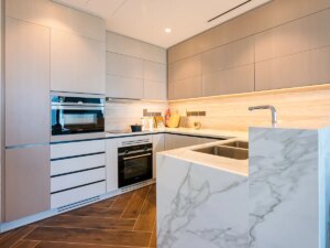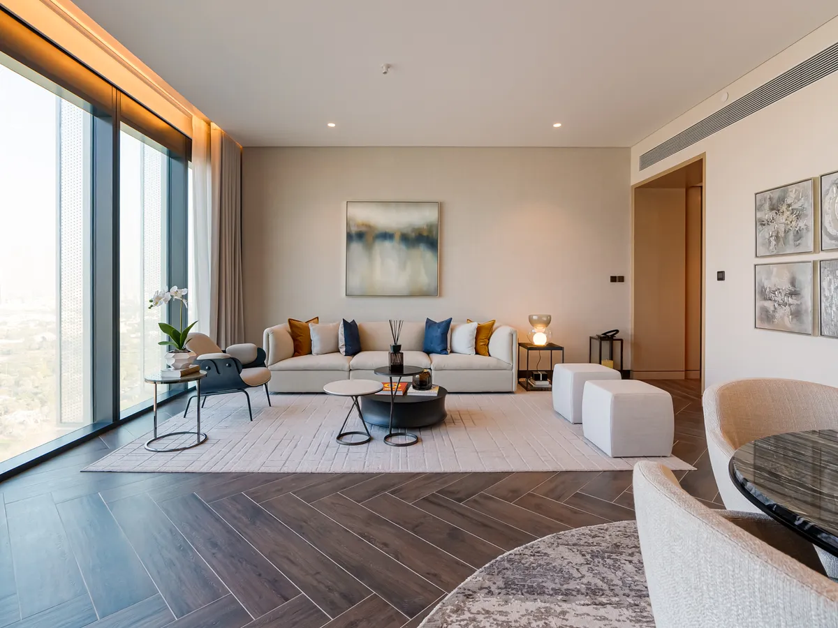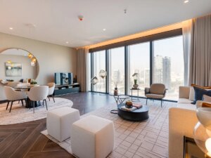Der Wohn-Ess- und Küchenbereich ist ein Meisterwerk moderner Eleganz. Alles ist mit hochwertigen Materialien ausgestattet und erstrahlt in einem zeitgemäßen Stil. Die Räum sind nicht nur großzügig gestaltet, sondern verfügen auch über bodentiefe Fenster, die einen atemberaubenden Blick auf die beeindruckende Skyline von Dubai bieten.