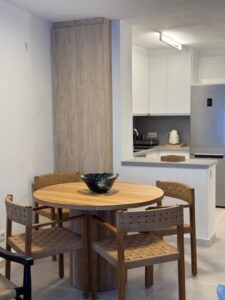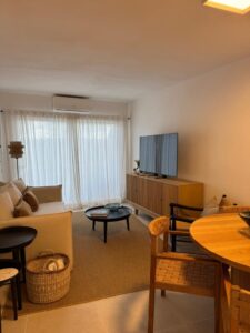 Diese stilvoll renovierte Wohnung im 3. Stock (mit Aufzug) liegt direkt an der Strandpromenade von Sa Coma und bietet einen unvergleichlichen Blick auf das Mittelmeer. Auf ca. 70 m² Wohnfläche verteilen sich 2 Schlafzimmer, 1 modernes Badezimmer, ein heller Wohn- und Essbereich sowie eine voll ausgestattete Küche mit hochwertigen Geräten von SMEG und Samsung. Die Wohnung ist komplett möbliert mit exklusiven Designermöbeln von Unicorn Manacor und sofort bezugsfertig. Eine private Terrasse mit Meerblick, ein Gemeinschaftspool, ein eigener Parkplatz sowie gepflegte Außenanlagen runden das Angebot ab. Ideal sowohl als Ferienimmobilie als auch als dauerhafter Wohnsitz.